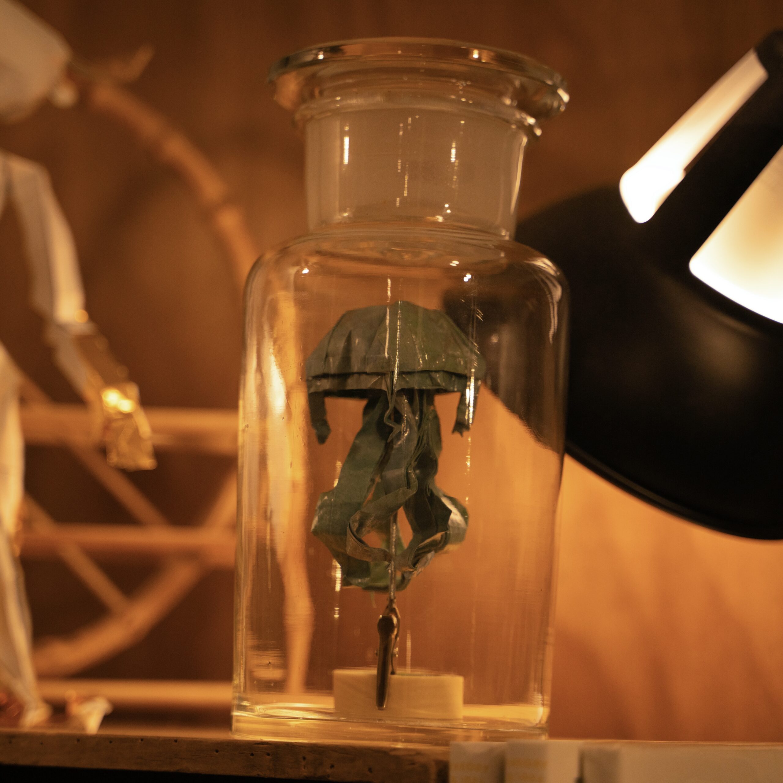 This space is decorated with origami jellyfish that look like they are floating; I recommend using wire with display crocodile clips on both ends, which you can find on Amazon.