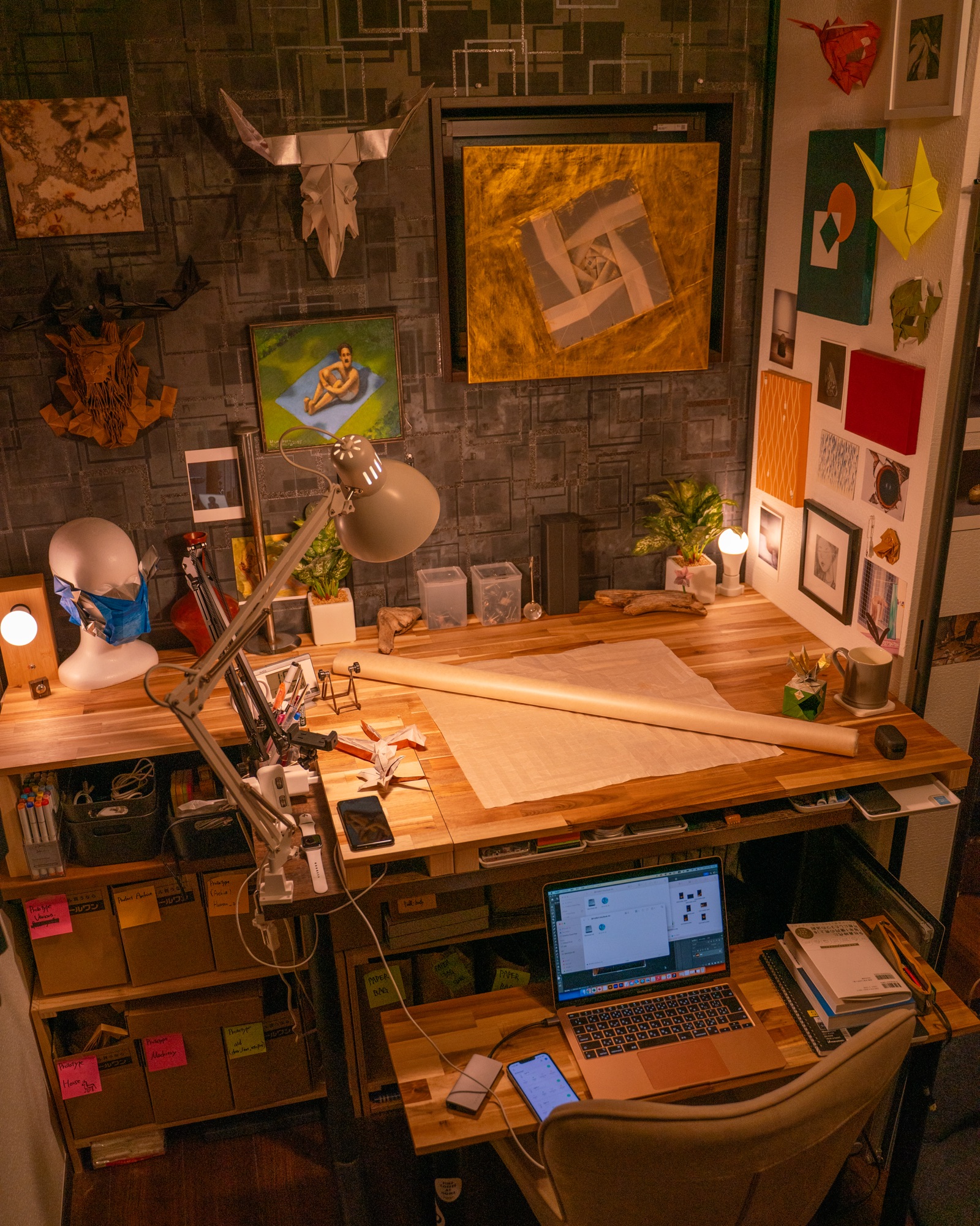 Finally, let’s explore the creative workspace. Combining paintings and origami in this area can create an organized and inspiring environment for work.