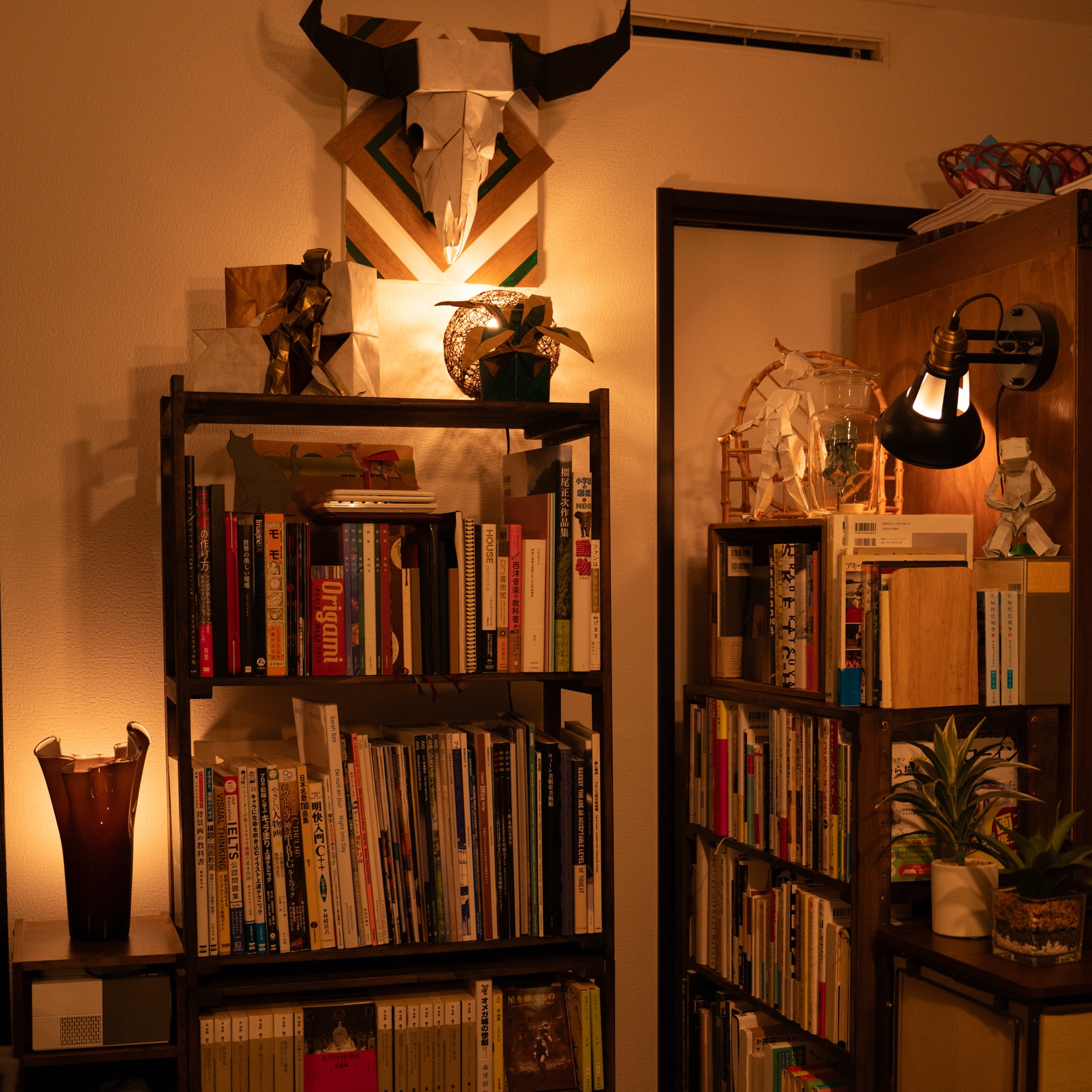 Since the top of the shelf tends to be a dead space, I display object-based origami with a strong presence, such as dolls and cow bones.